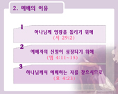 <예배>에 관한 파워포인트 자료입니다. 1. 예배의 정의 2. 예배의 이유 3. 예배의 장소 4. 예배의 요소 5. 예배의 방법 6. 예배의 종류 이 자료는 사용자의 편의에 맞게 수정과 편집이 가능하므로 내용 및 순서편집을 직접 하실 수 있습니다. 전 내용은 100% 수정이 가능하므로 교회의 실정에 맞게 변경하여 사용하실 수 있습니다.