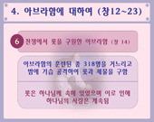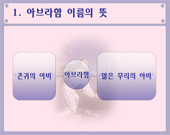 <믿음의 조상 아브라함>에 관한 성경공부 파워포인트 자료입니다. 내용구성: 1. 아브라함 이름의 뜻 2. 가족의 배경 3. 아브라함의 행적 4. 아브라함에 대하여 5. 아브라함을 통해 배우는 교훈 이 자료는 사용자의 편의에 맞게 수정과 편집이 가능하므로 내용 및 순서편집을 직접 하실 수 있습니다. 전 내용은 수정이 가능하므로 교회의 실정에 맞게 변경하여 사용하실 수 있습니다.