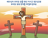 예수님이 우리를 위하여 죄의 대가로 대신 십자가에서 죽으심으로 우리는 죄로부터 구원을 얻었어요.