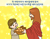 그 때 한 어린아이가 제자들에게 와서 자기가 먹으려고 싸온 도시락을 내어 놓았어요.