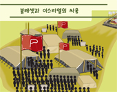 사울 왕은 이스라엘 사람들을 모으고 블레셋 사람들과 전쟁을 하고자 진을 쳤지요. 이스라엘 군과 블레셋 군은 골짜기를 중심으로 이편과 저편으로 진을 치고 싸울 준비를 하고 있었어요.