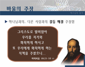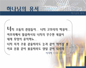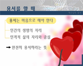 분류 : 파워포인트 설교 대상 : 청,장년부 용서는 하나의 행동이다. 그리고 용서는 이미 앞에 있던 관계의 일에 대해 부정적인 측면 또는 소극적인 측면을 전제로 하고 그것을 극복하는 행동이다. 또 용서는 그 목적이 분명하다. 즉 용서는 온전함(wholeness)과 구원(salvation)을 찾는 행위이다. 만일 용서가 위장된 행위이거나 정치적인 목적으로서 상대방을 어려운 궁지에 몰거나 나의 입장을 유리하게 만드는 것이라면 그것은 오늘의 목적에서 벗어난 것으로서 더 이상 우리에게 거론하고 다룰 대상이 아니다. 이 자료는 사용자의 편의에 맞게 수정과 편집이 가능하므로 내용 및 순서편집을 직접 하실 수 있습니다. 전 내용은 100% 수정이 가능하므로 교회의 실정에 맞게 변경하여 사용하실 수 있습니다.
